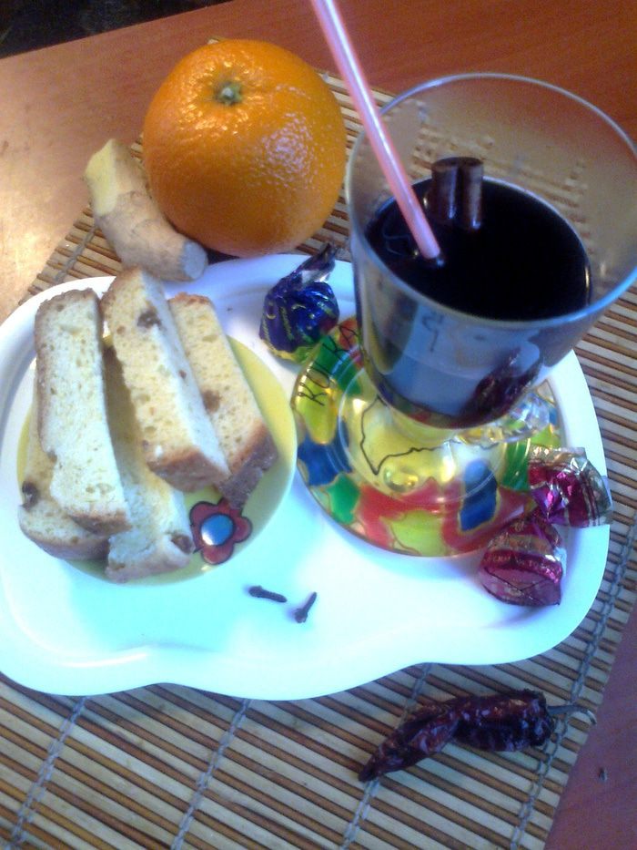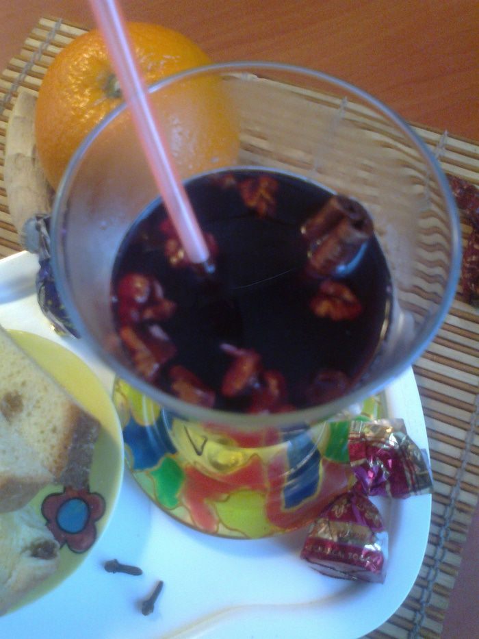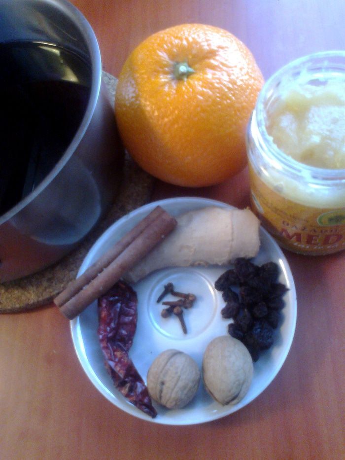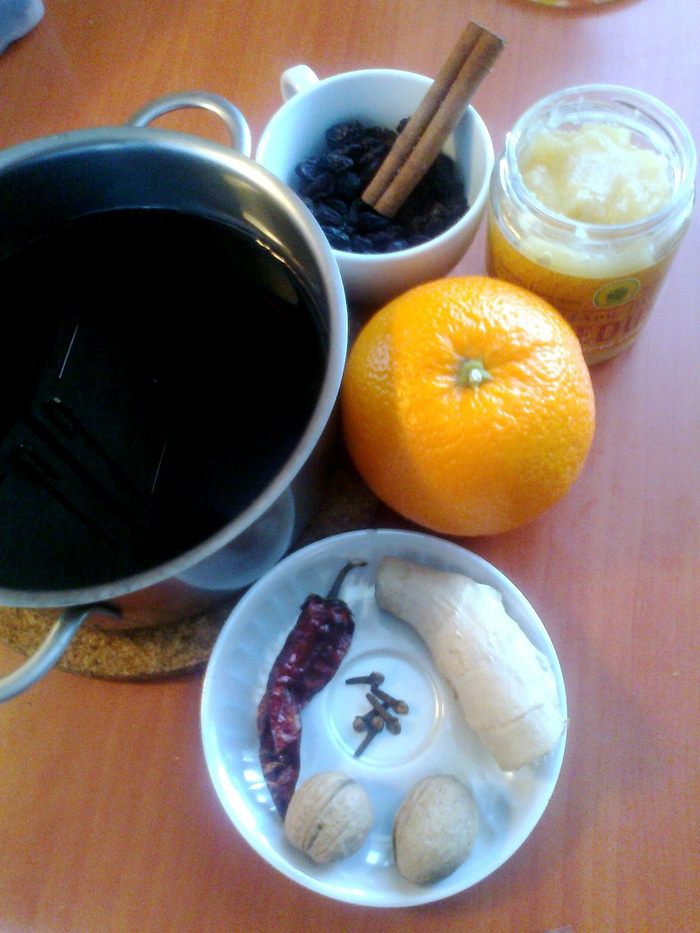 Берем 1 л сухого красного вина (я предпочитаю Мерло), из пряностей в обязательном порядке-корица, гвоздика, душистый перец, кардамон (3-5 штук) и имбирь (свежий или сухой), можно добавить анис, бадьян, лавровый лист, цедру лимона, изюм... Один апельсин или пару мандаринов разрезать поперек на две части и тоже положить в вино. На слабом огне нагреть до 80-90 градусов, не кипятить, дать настояться под крышкой не меньше часа. Апельсин выжать, процедить, добавить мед или сахар. Можно в стаканы добавить кусочки зеленого яблока. Желательно подавать в толстостенных прозрачных бокалах. Пить горячим.
