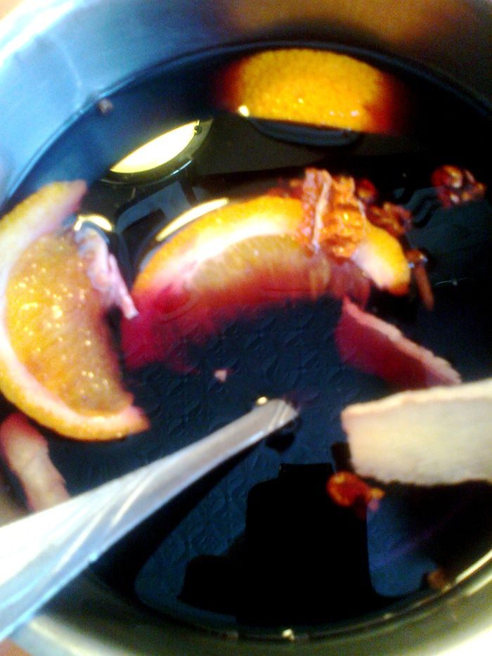 Выливаем вино в кастрюлю с корицей и дольками апельсина с кожурой,кидаем туда гвоздичку,кусочки грецкого ореха и перчик чили(не больше 1кв.см!)