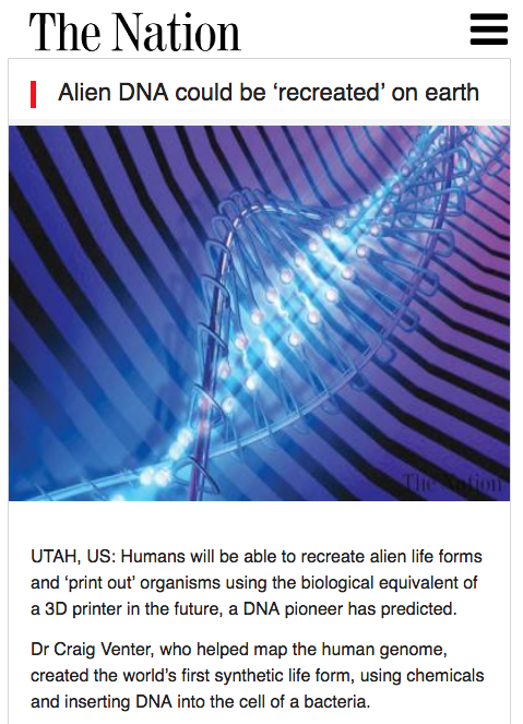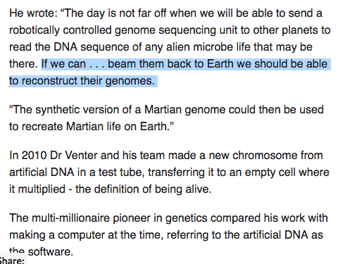And here's my absolute favorite: a plan to send robotic probes to the furthest reaches of space so we can "beam back" alien DNA for re-sequencing and 3D printing. I mean, put aside the whole Andromeda Strain possibilities at work, how can it possibly be a good idea to reconstruct alien microbes here on earth?
