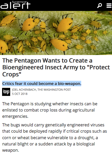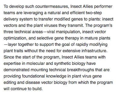 The actual DARPA press release for "Insect Allies" cloaks all this chicanery in a heapin' helpin' of jargon and doubletalk but if the batteries your bullshit detector are fully charged you'll see that what they're talking about falls in line with the synopsis The Daily Grail provides.