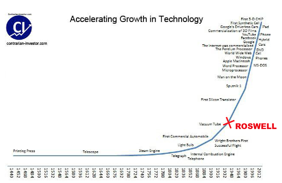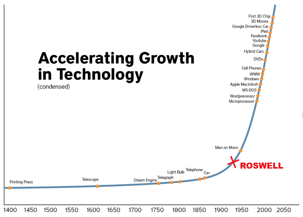 Why, it goes like this: without all this newfangled technology-- that all seemed to drop in out of the sky after a weird sequence of events one summer's day in 1947, allegedly-- a hypothetical alien race would never be able to "beam" their genomes through the far reaches of space and down load it all into our handy-dandy new D::Waves and create hybrid bodies for themselves using our blood plasmas and embryonic stem cells and so on and so forth.